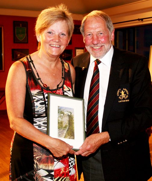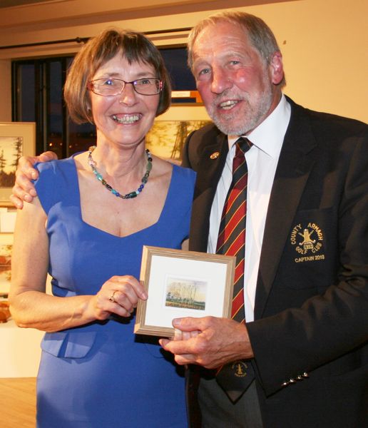 Maureen Hanna receives her Visitor’s Prize from County Armagh Golf Club Captain John Flack
