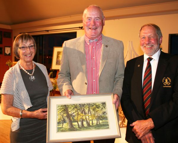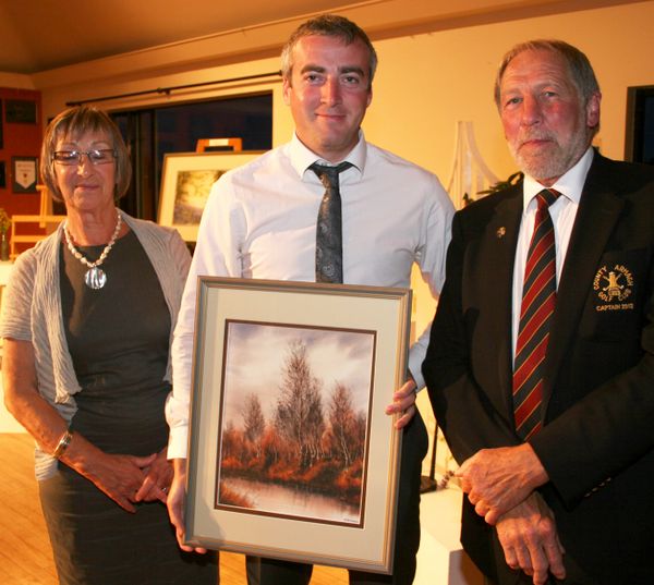 Stewart Stevenson, Gross Prize winner at County Armagh Golf Club Captain’s Day, is presented with his prize by Club Captain John Flack and his wife Toni