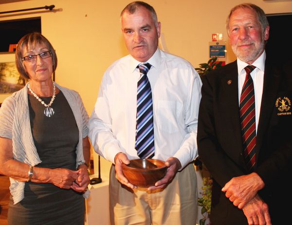 Barry Scully, winner of County Armagh Golf Club Captain’s Day, is presented with his prize by Club Captain John Flack and his wife Toni