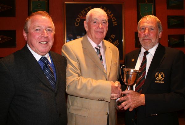 Philip Russell presented the Pat Russell Memorial Trophy to County Armagh Golf Club Captain John Flack and Senior League Convenor Gerry McCreesh. The Senior League, sponsored by Specsavers, was won by Roy Turner (not pictured) with Johnny Palmer and George Gillespie runners up.