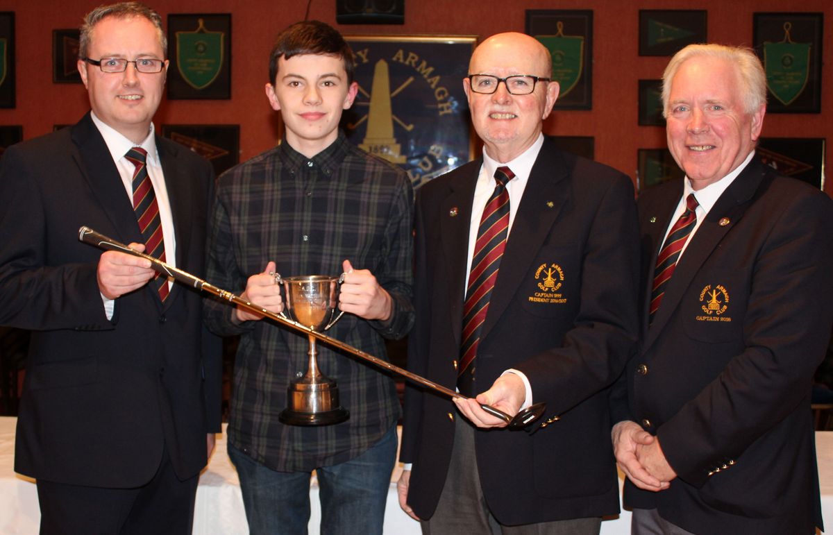 County Armagh Golf Club Juvenile Golfer of the Year Conor Brady is presented with Gerry Watters Trophy by Club President Walter Neville, Captain Martin Oliver and Juvenile Convenor Neil Cromwell (left).
