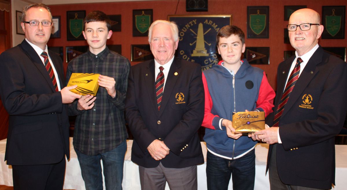 County Armagh Golf Club Juvenile Winter League winners Conor Brady and Steven Donaghy are pictured with Juvenile Convenor Neil Cromwell, Club Captain Martin Oliver and Club President Walter Neville.