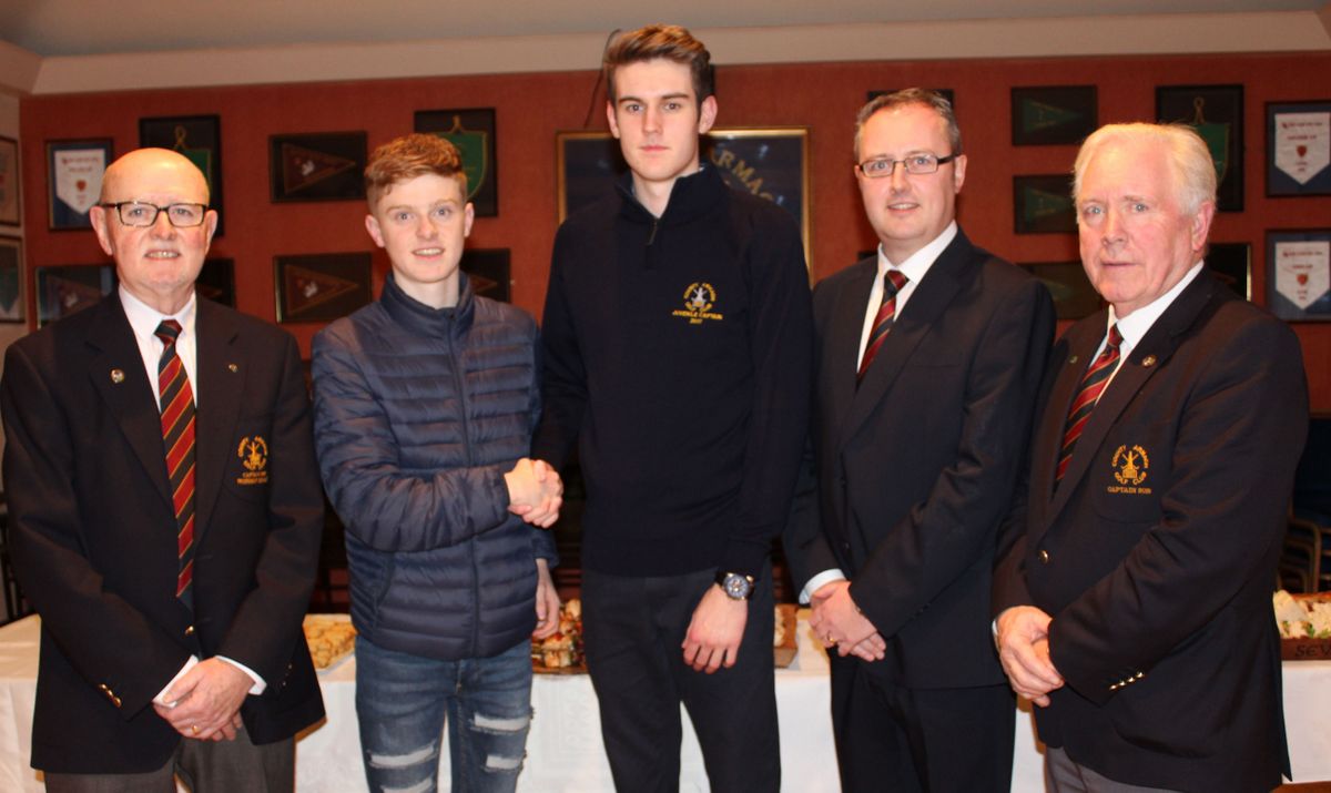 County Armagh Golf Club Juvenile Captain Lee Campbell hands over to 2017 Juvenile Captain Adam Cromwell in the company of Club President Walter Neville, Club Captain Martin Oliver and Juvenile Convenor Neil Cromwell.