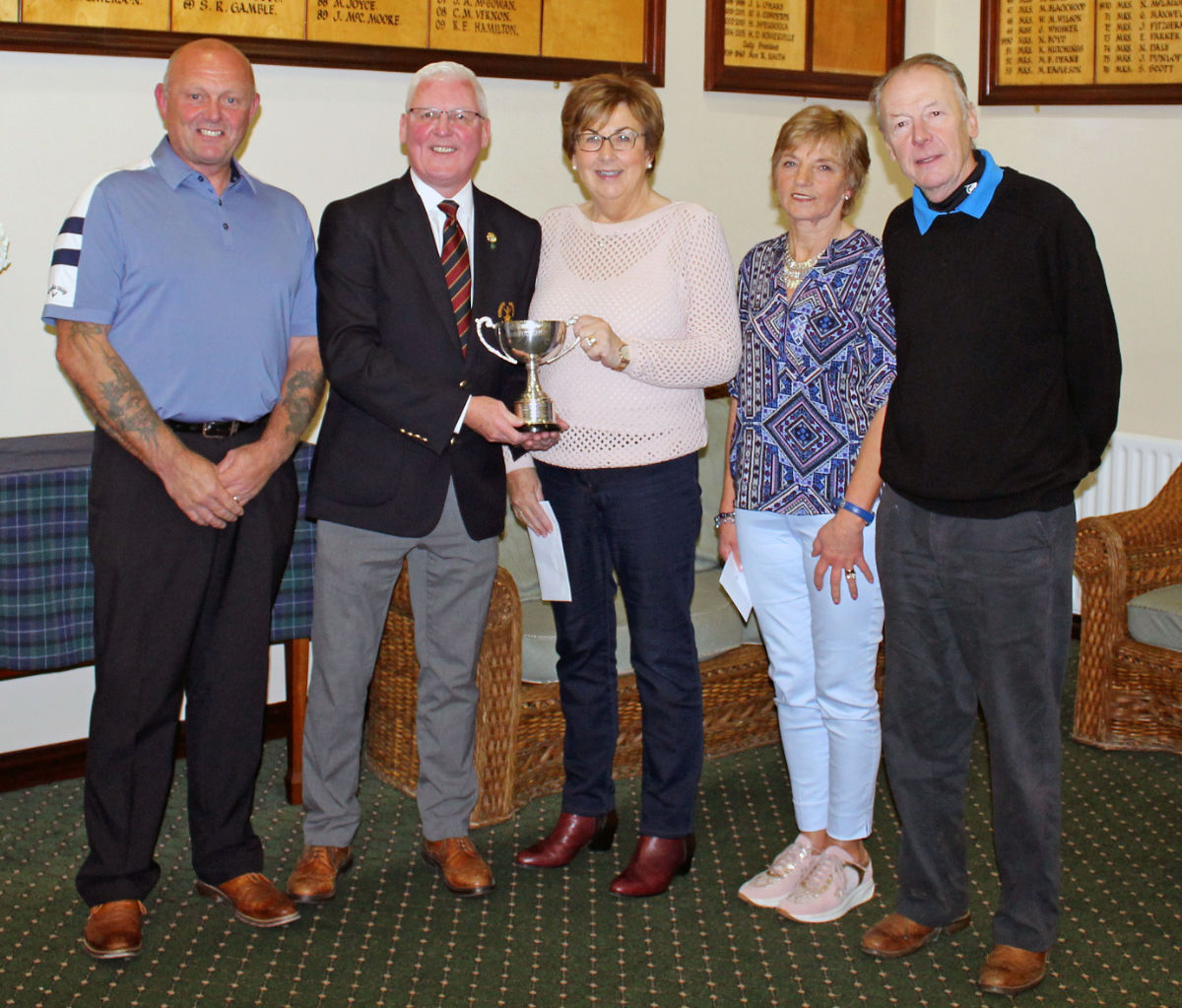 County Armagh Golf Club Captain, Richard Stewart, presents the Mixed Matchplay competition trophy to winners, Jimmy Wilson and Teresa Corrigan. Also pictured are runners-up Gladys and Rodney Villiers.