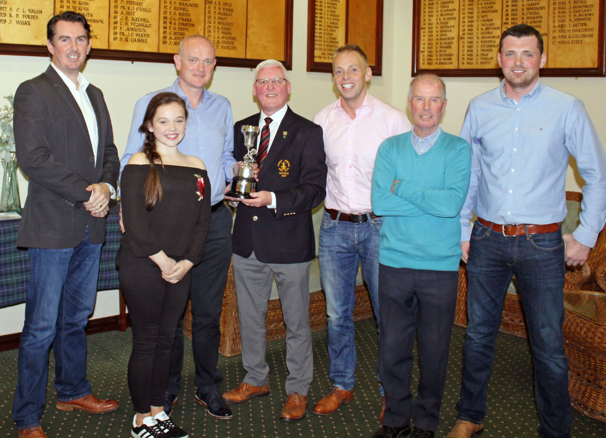 Eamon McCaffrey is presented with the prestigious Tuesday Cup trophy by County Armagh Golf Club Captain, Richard Stewart. Eamon's daughter joined him for the presentation photo, which also includes other prizewinners (L-R) Kenny Edgar, Mark Frazer, Joe Rhodie and Sean Dougan Jnr.
