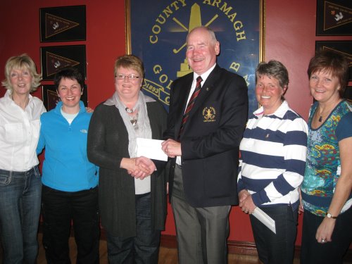 County Armagh Golf Club Captain Tom Calvert congratulates Dorothy Harris, winner of the St Patrick's Day Ladies Stableford competition. Included are other prizewinners in the Ladies competition, from left to right, Moya Brady, Mary Black, Hilary Johnston and Flo McCall.