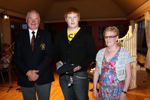 Thomas Clarke (centre) was the winner of the Juvenile Boys (Senior) competiton on Captain's Day and is picted with Captain Tom Calvert and wife Renee