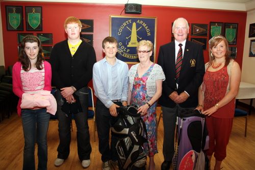 County Armagh Golf Club Captain Tom Calvert and wife Renee are pictured juvenile prize winners Maeve Mallon, Caoimhe, Christopher Jennings, and Thomas Clarke