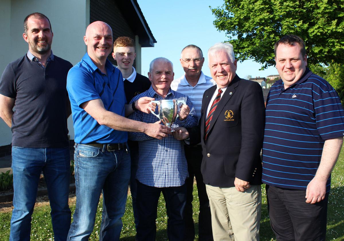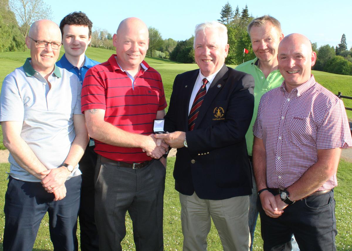 Davy Leeman is presented with the May Medal by County Armagh Golf Club Captain Martin Oliver, with category prize winners (L-R) Gerry Cullen, Joe Rooney, Cormac O'Hare and John Lavery