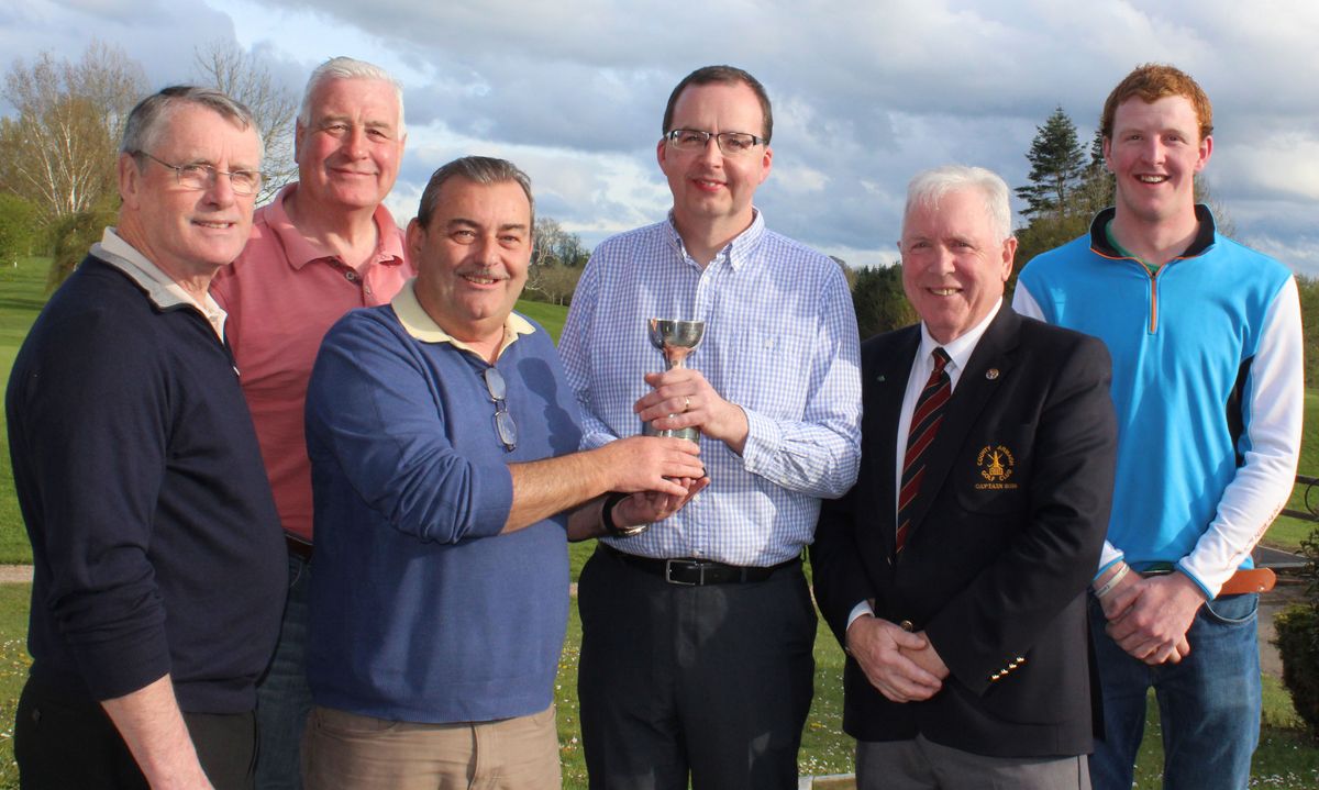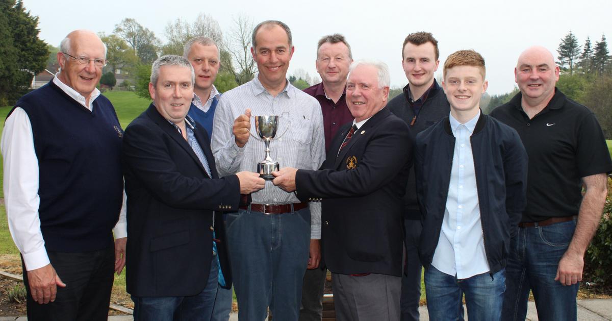 The Hirsh Cup is presented to Paul Quinn by Cormac Knott from Netstretch Ltd, sponsors of the annual stroke competition at County Armagh Golf Club, and Club Captain Martin Oliver. Included also are category prizewinners Brendan Beagan, Eamon Toner and Shea Smith
