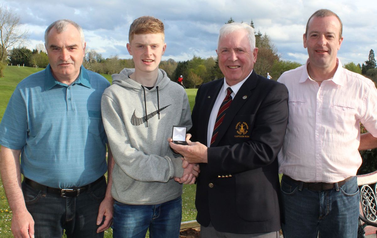 County Armagh Golf Club Captain Martin Oliver presents the April Medal to Juvenile Captain Lee Campbell. Included also are category prize winners in the first medal competition of the season, Tom Donnelly and Johnny Brown