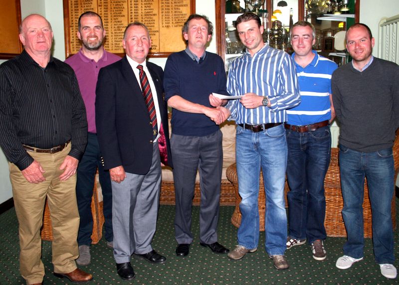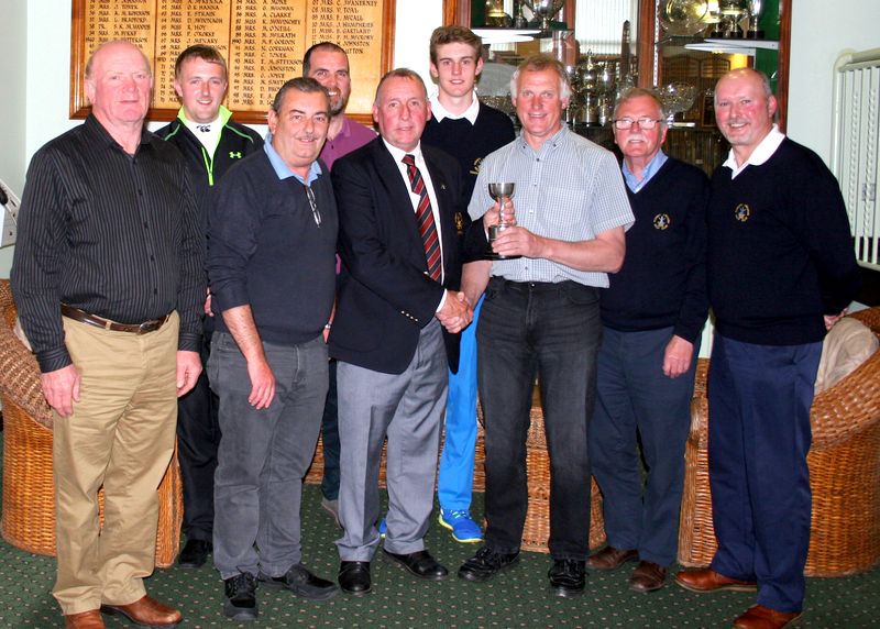 Colm McElory is presented with his prize by Andrew Johnston from Armagh Potato Company Ltd, sponsors of the PGA Tankard competition at County Armagh. Included also is Club Captain Richard Black and category winners Danny Magee, Lee Kirane, Stewart Stevenson and Ronan O’Reilly.