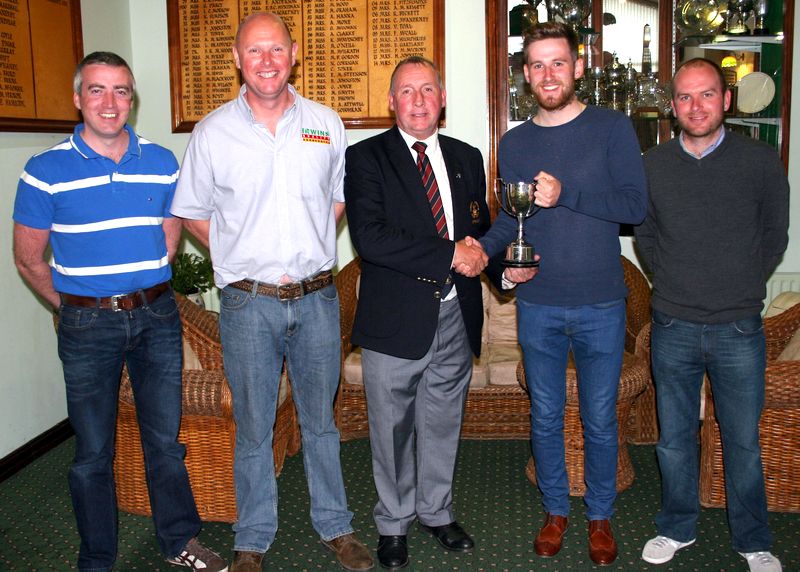 County Armagh Golf Club Captain Richard Black presents the Bumble Bee Cup to Philip Kelly, winner in the company of runner up Stewart Stevenson, Alistair Harrison from competition sponsors Irwin Aggregates Ltd, and Ronan O’Reilly, category winner.