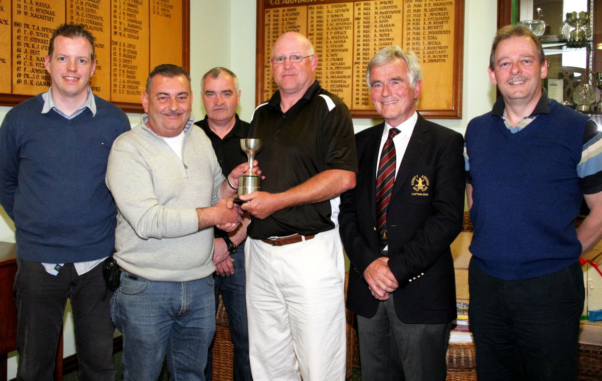 Neil Linton is presented with the Bumble Be Cup by County Armagh Golf Club Captain Pat mcAleavey and Alistair Harrison WD Irwin Aggregates who sponsored the competition. Inlcuded also (l-r) are runners up, Rodney Villiers, Paddy Burns, Pat Kelly and Paddy Hicks