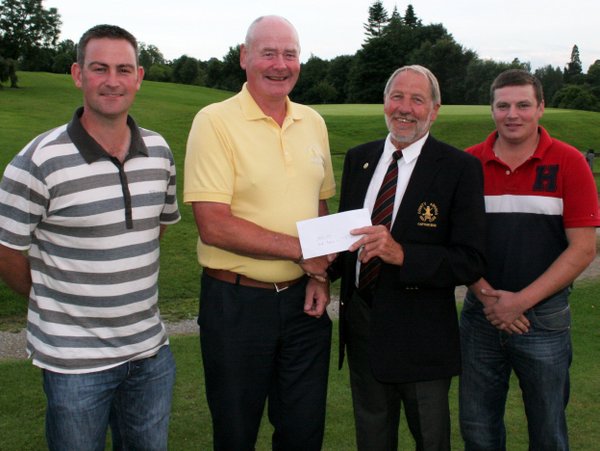 County Armagh Golf Club Captain John Flack presents Tom Calvert with his prize after winning the Open Week stroke competition sponsored by Alexanders of Markethill . Included also are runners up James Johnston (right) and Thomas Murray.