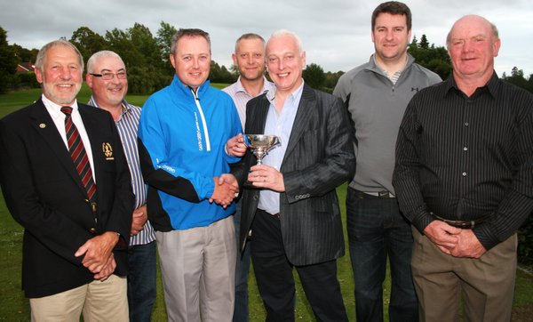 Neil Cromwell is presented with the Allen Cup by Brian Graham from JR McMahon, Armagh, who sponsored the recent stroke competition at County Armagh Golf Club. Included also are (from left) Club Captain John Flack and category prize winners Gerry Kelly, Brian Loney, Stephen Maloney and Danny McGee
