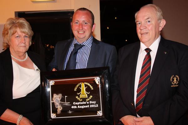 The Visitors Prize at County Armagh Golf Club Captain's Day was won by Brian Daly. Presenting him with his prize is Club Captain Brendan Smith and wife Bernie.