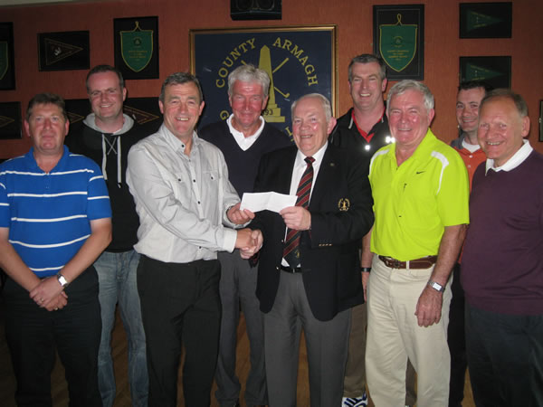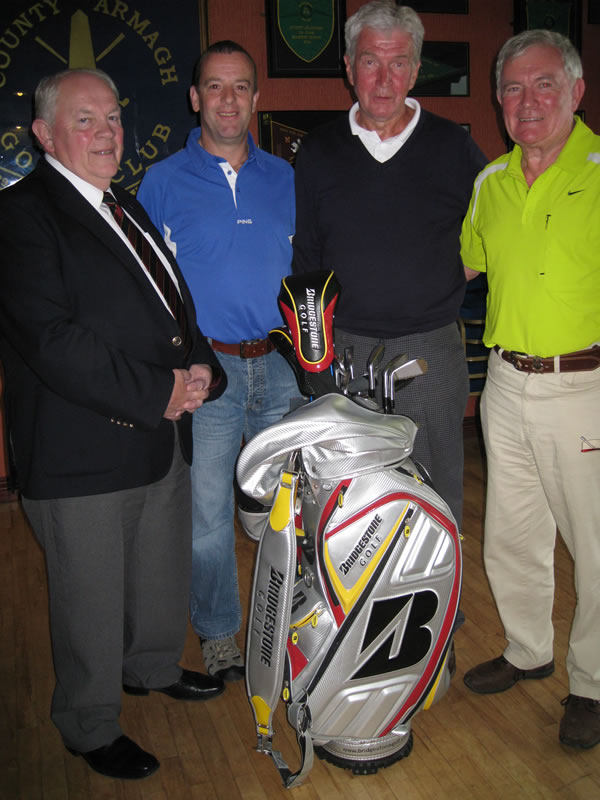 County Armagh Golf Club Captain Brendan Smyth is pictured with Paddy Duffy (right) who raised almost £2,000 to help send little Caoimhe to America for a life-changing operation with a prize draw for a set of Bridgestone clubs. They were won by Johnny Palmer (second from left) who auctioned them to further boost the fundraising efforts and Johnny Brown was the delighted recipient when the auction was completed.