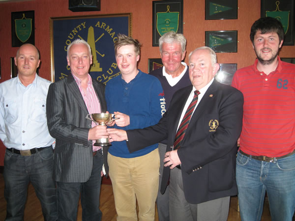 Shea Brady is presented with the Allen Cup by Brian Graham, representing competition sponsors JR McMahon, Armagh, and County Armagh Golf Club Captain Brendan Smyth. Included also are (from left) David Grimley, Johnny Palmer and Jarlath McReynolds, category prizewinners in the competition.
