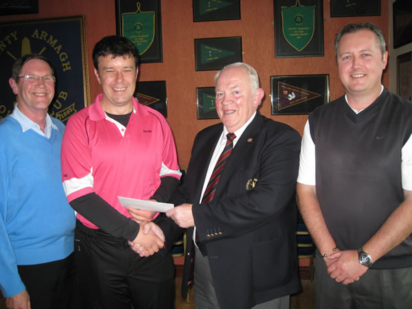 Shane O'Halloran is presented with his prize by County Armagh Golf Club Captain Brenadn Smth after winning the recent Club stableford competition. Looking on are runners up Jimmy Quinn and Neil Cromwell.