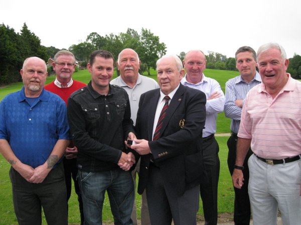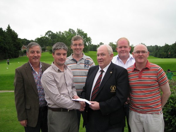 Pictured receiving his prize from Club Captain in the W D Irwin sponsored stableford competition is overall winner Bernard Grimley (42 pts) together with Kieran Grimley, Andrew Clarke, Damian Smyth and George Bradshaw.