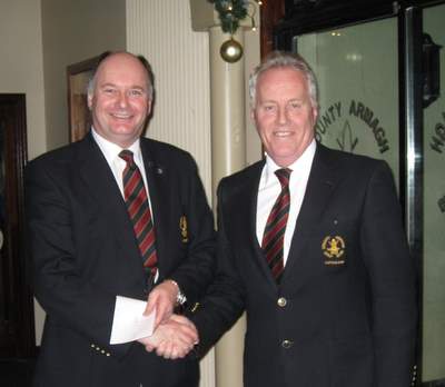 The Captain Eric Hamilton presents Paul McCreesh with the winners prize for the inaugural nine hole competition