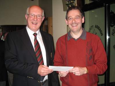 The outgoing Captain Charles Vernon presents first prize to David Baird the winner of the Captains Farewell Competition