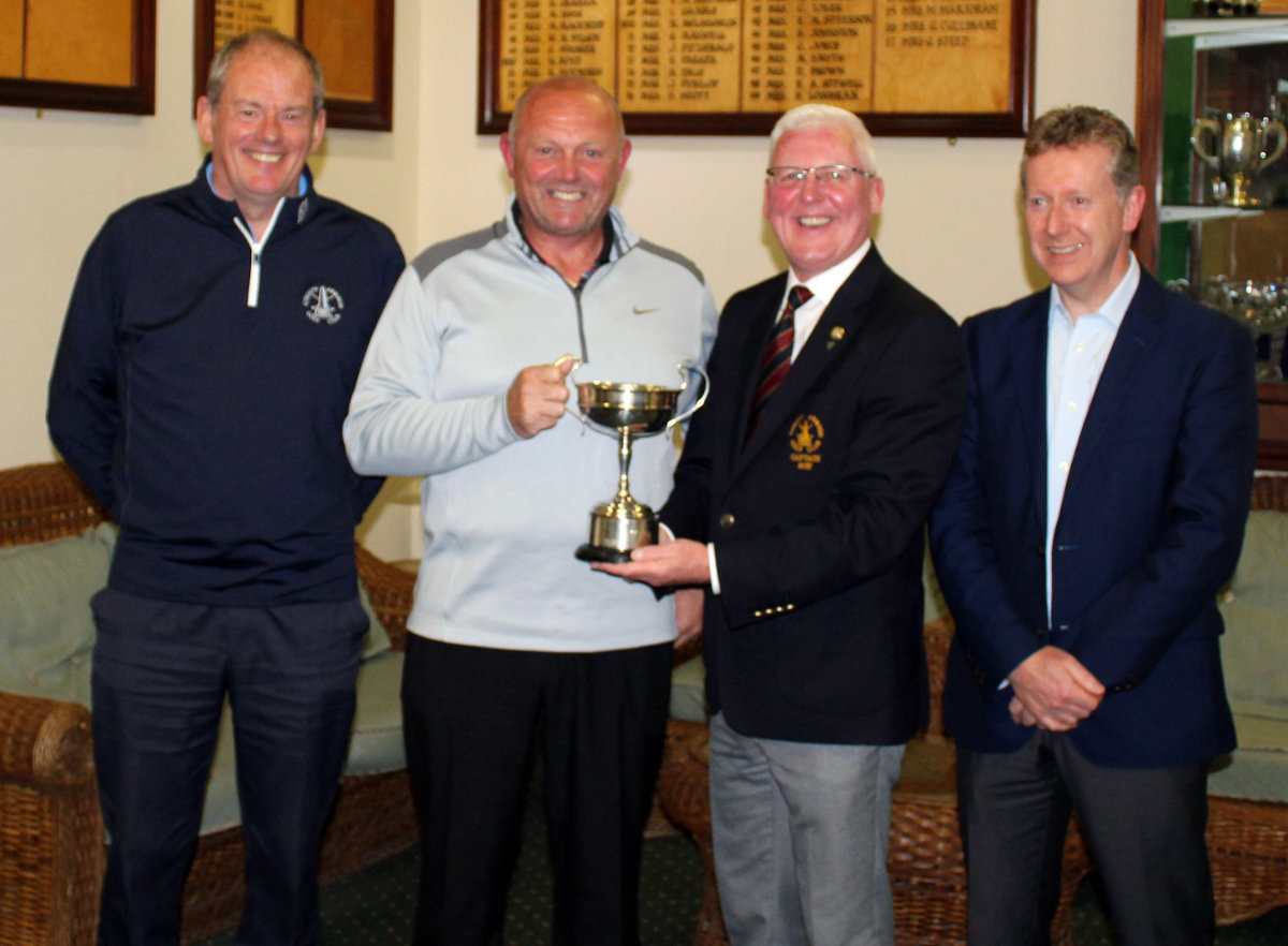County Armagh Golf Club Captain, Richard Stewart, awards the Half-Century Cup to Jimmy Wilson. Also pictured are Ian O'Hea and Paul McCurry, who came 2nd and 3rd respectively.
