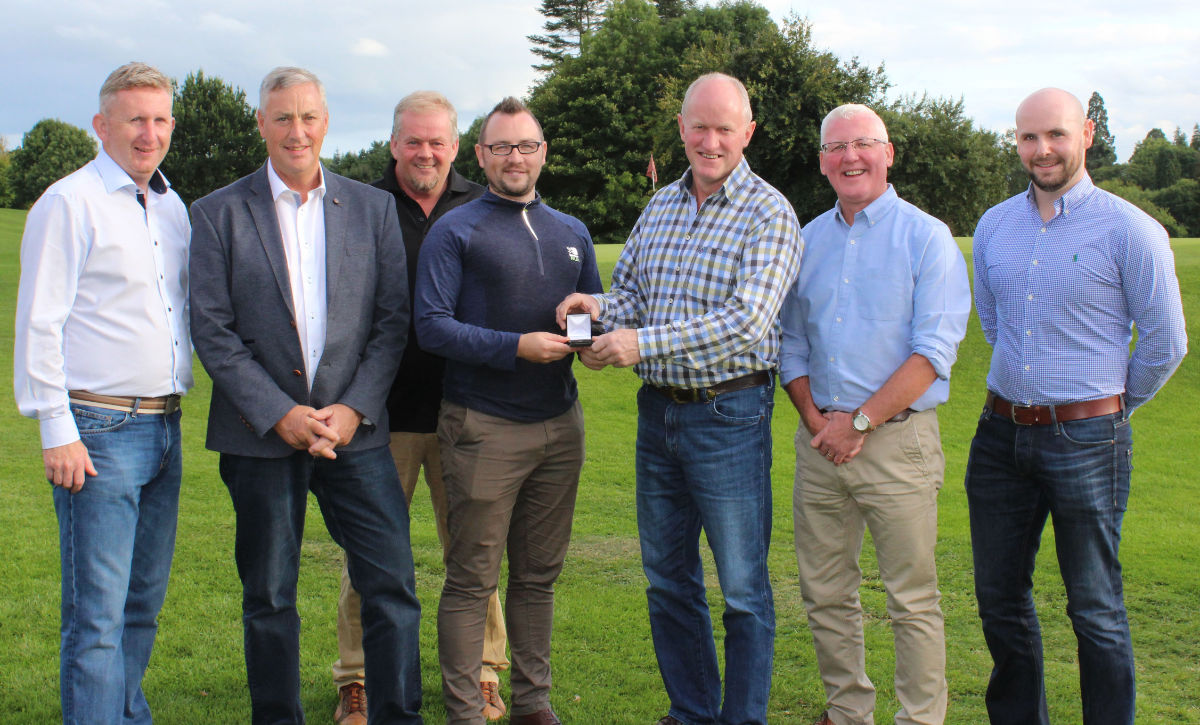 Paul Traynor is presented with the County Armagh Golf Club August Medal by competition sponsor Gerard Byrne, proprietor of Gerard Byrne Tyres. Also pictured are Club Captain Richard Stewart and other prizewinners (L-R) Oliver Connell, Norman Mallon, Derick Hynes and Caolan Doyle.