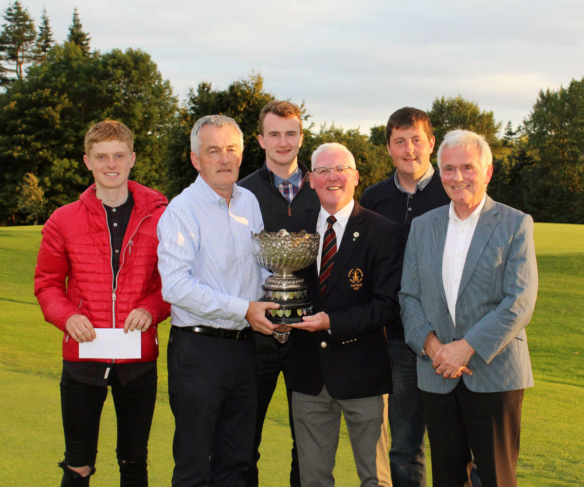 County Armagh Golf Club Captain, Richard Stewart, presents the Gerry Lenagh Memorial Trophy to Gary McAleavey, winner of the annual Open Stableford competition sponsored by Morgan McLernon Transport Ltd. Also pictured are other prizewinners (L-R) Lee Campbell, John Vernon, Jarlath McReynolds and Pat McAleavey.