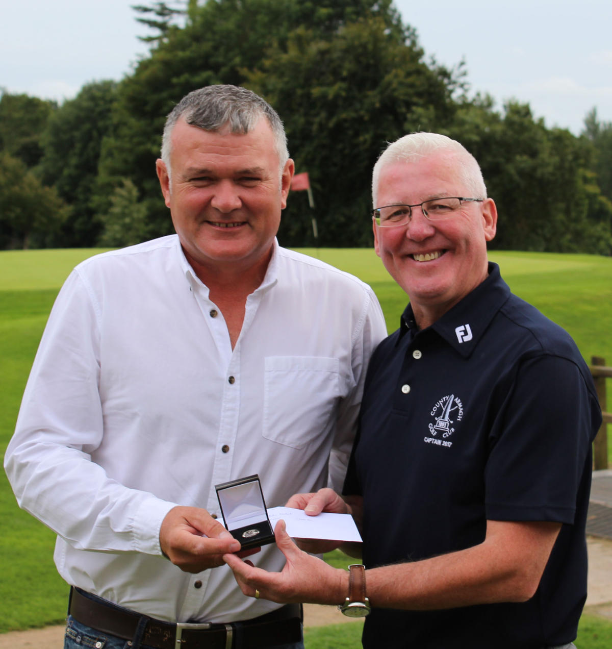 Sean Dougan, winner of the July Medal sponsored by Alexander Mills, is congratulated by County Armagh Golf Club Captain Richard Stewart.