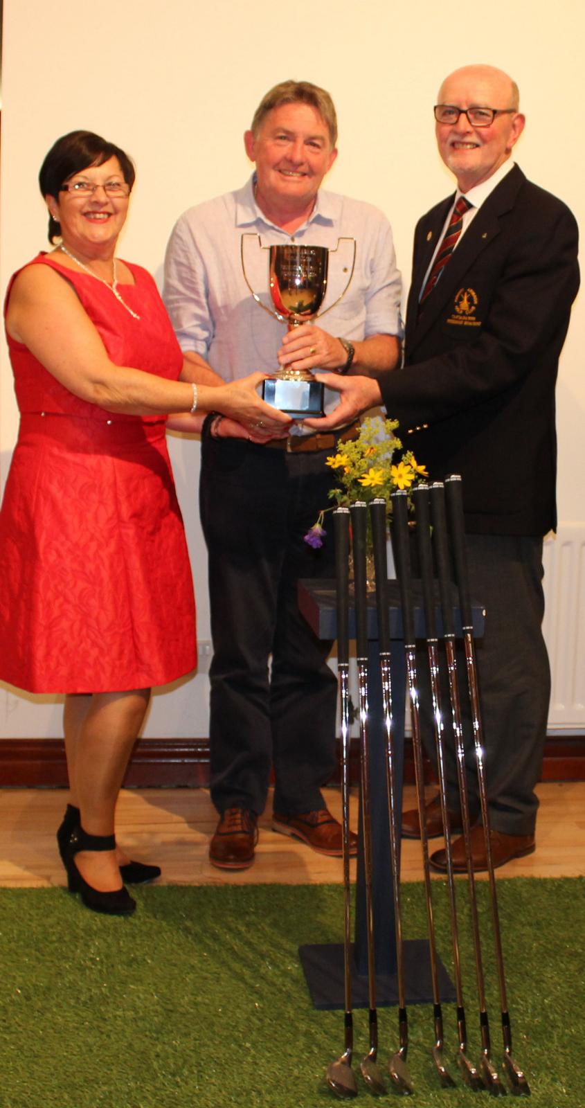 Noel Muldoon is presented with the new County Armagh Golf Club President's Day Perpetual Cup and a set of Mizuno irons by President, Walter Neville, and his wife Mabel