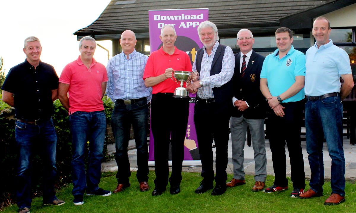 Desmond Kinsella is presented with the Henry and May White Memorial Open Trophy by Philip White, proprietor of Philip White Tyres Ltd, sponsors of the annual competition at County Armagh Golf Club. Also pictured are Club Captain Richard Stewart and other prize winners (L-R) Conor McAneney (4th overall), Stewart Stevenson (1st gross), David Grimley (3rd overall), James Johnston (2nd gross) and Johnny Brown (5th overall).
