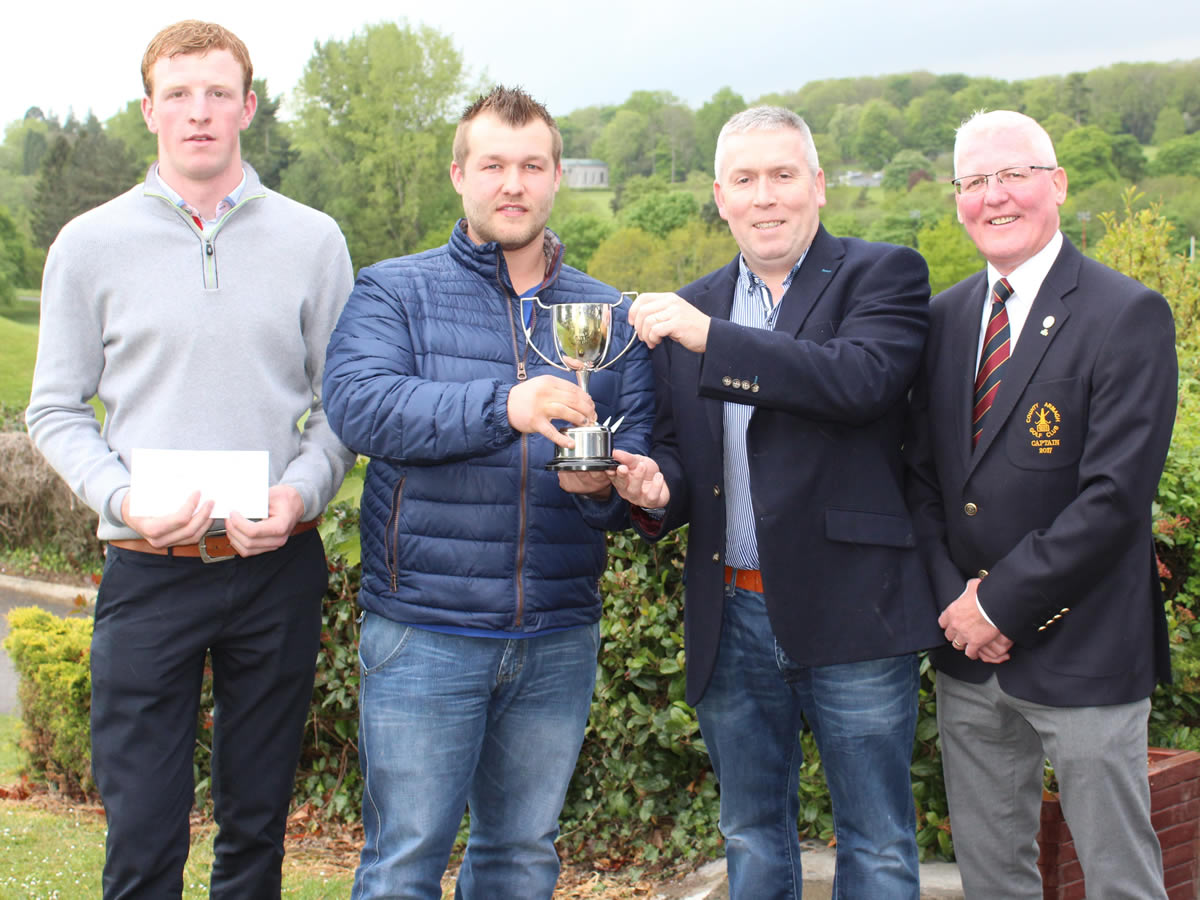 Christopher Lester receives the Bumblebee Cup from Nicky Currie, proprietor of Victoria Bar, Armagh. Also pictured are Club Captain Richard Stewart and Shea Smyth, competition runner-up.