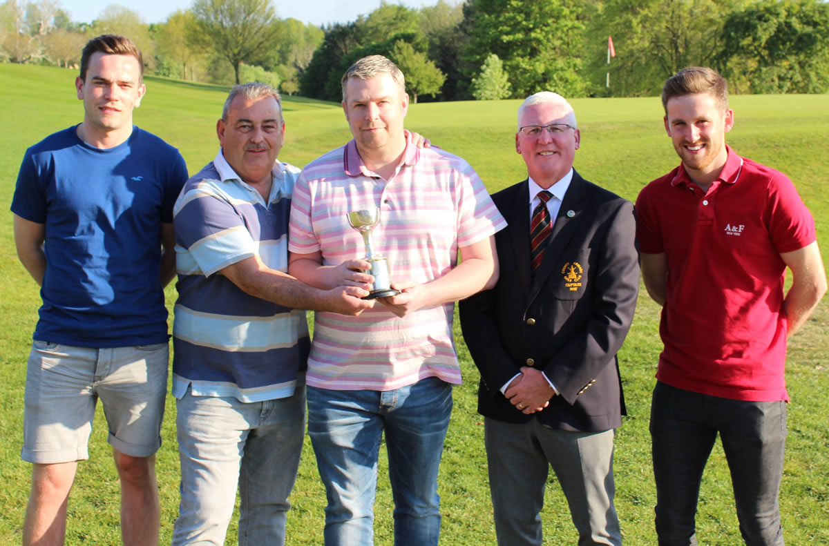 Hirsch Cup winner Darren Wilson receives the trophy from Cormac Knott of Netstretch Web Design, who sponsored the competition. Also pictured (L-R) are runner-up Mark Shannon, Club Captain Richard Stewart and Philip Kelly, best gross.