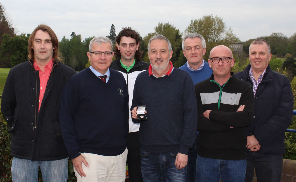 April Medal runner-up Kieran Grimley is pictured with Vice Captain Colm Shannon, sponsors Steven and Andrew Miller (Painters and Decorators) and category prize winners Gary McAleavey, Malachy McSorley and Don McKee.