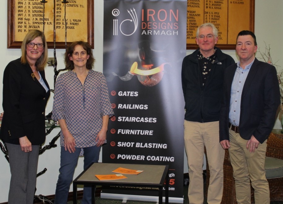 Alongside prize winners Anne and Enda O'Reilly are Lady Captain, Gail Steed, and Philip Devlin of Iron Designs Armagh.