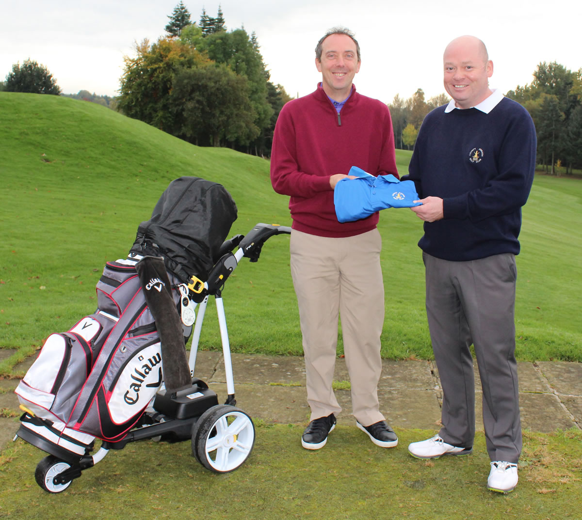 County Armagh Golf Club Professional Alan Rankin presents David Leeman with a club crested polo-shirt before he sets off to the Belfry in England for the HowDidiDo Order of Merit Grand Final.