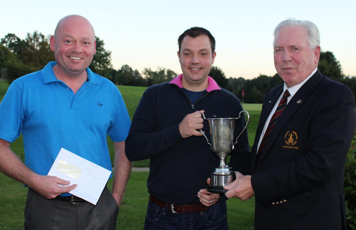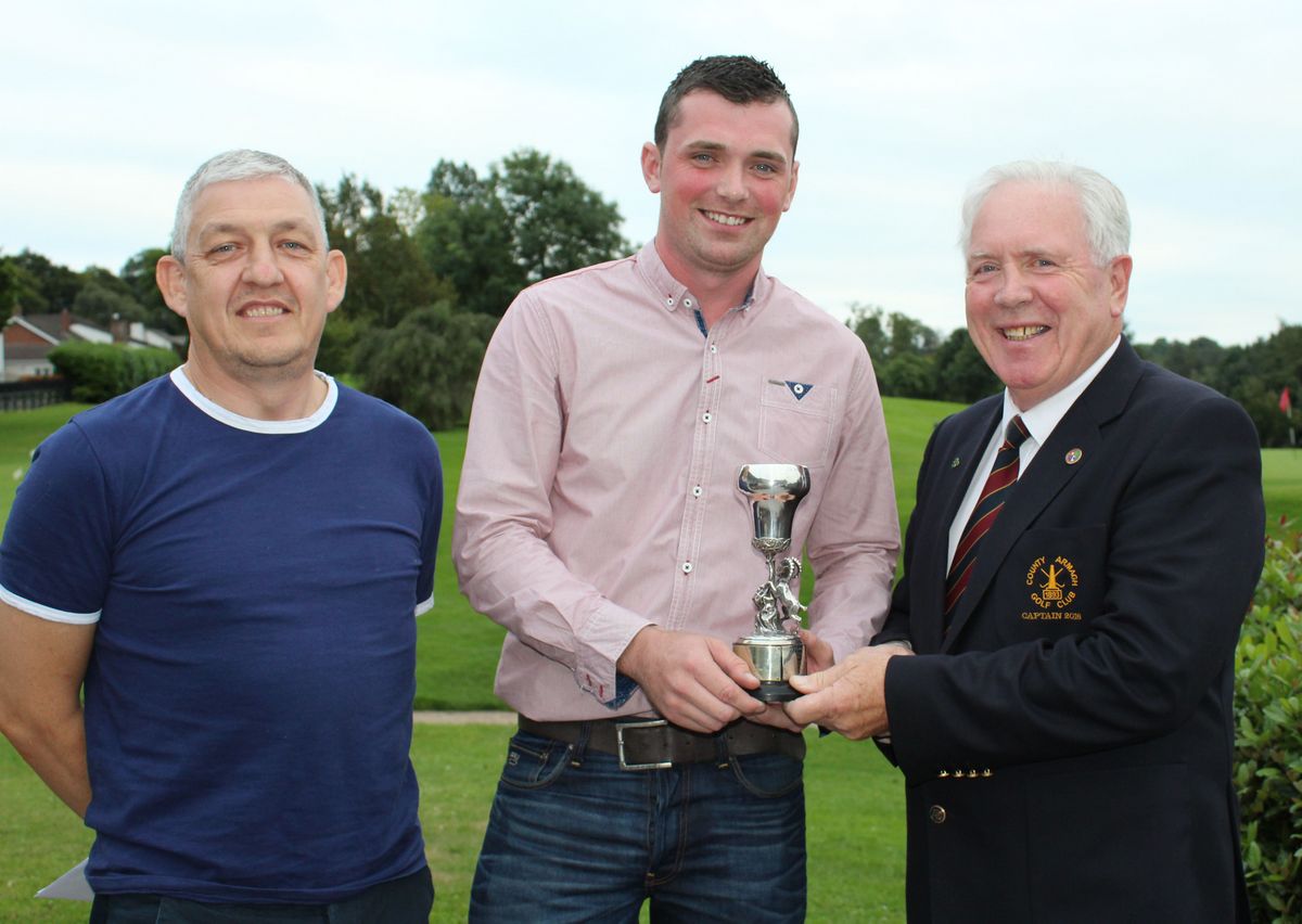 County Armagh Golf Club Captain Martin Oliver presents the Gray Cup to winner Gareth Reilly. Included also is David Leeman who was runner up in the club mahplay comeptition.
