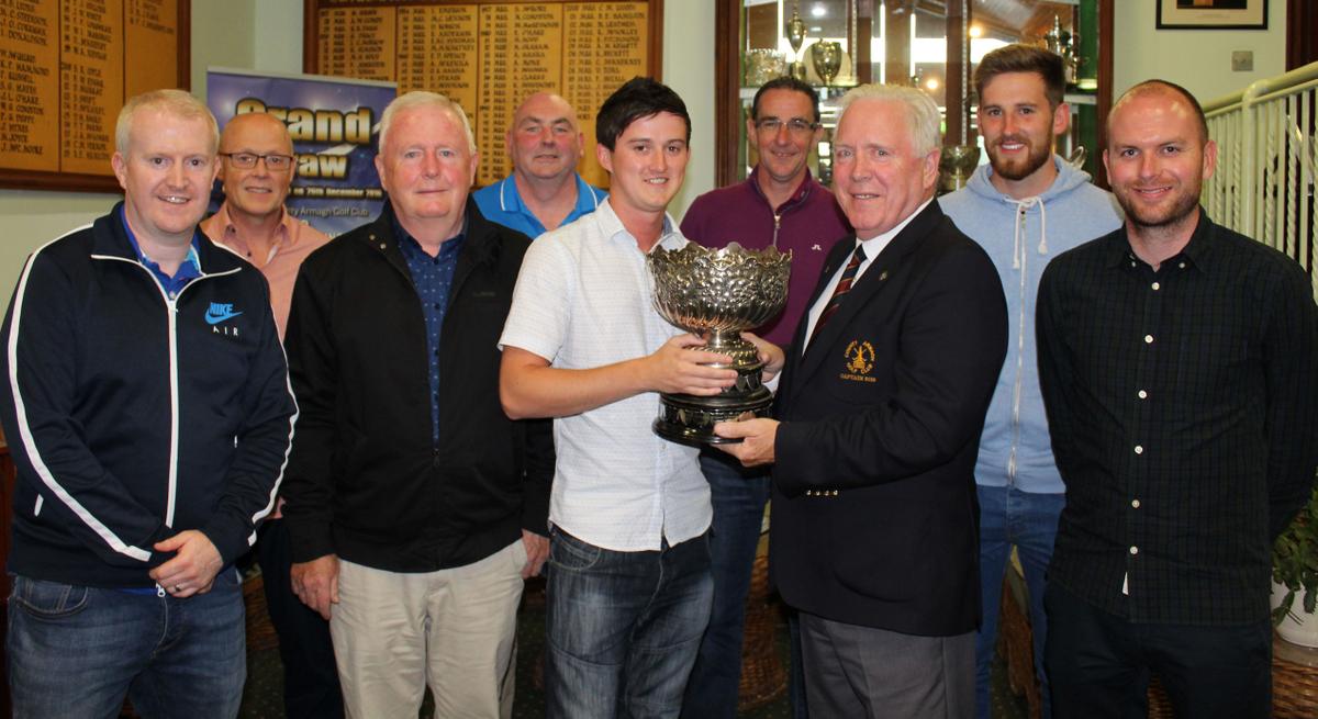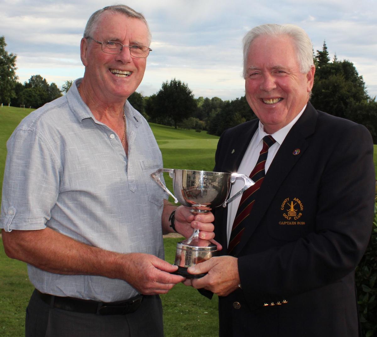 Brendan Beagan is presented with the Arthur Mayne Cup by County Armagh Golf Club Captain Martin Oliver.
