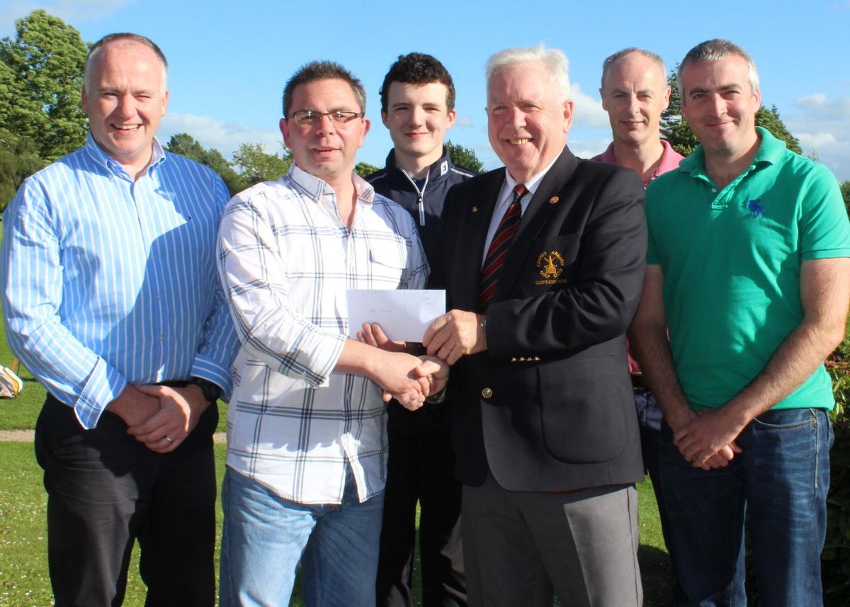 County Armagh Golf Club Captain Martin Oliver presents Stephen McGarvey with his prize after winning the Alexander Mills sponsored stableford competition. Included also are category prize winners Mark Loughran, Joe Rooney, Brendan Powell and Stewart Stevenson.