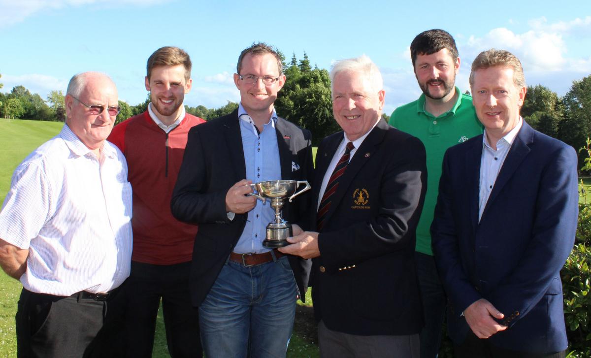 Martin Gill is presented with the JR McMahon sponsored Allen Cup by County Armagh Golf Club Captain Martin Oliver. Looking on are category prize winners in the annual stroke competition.