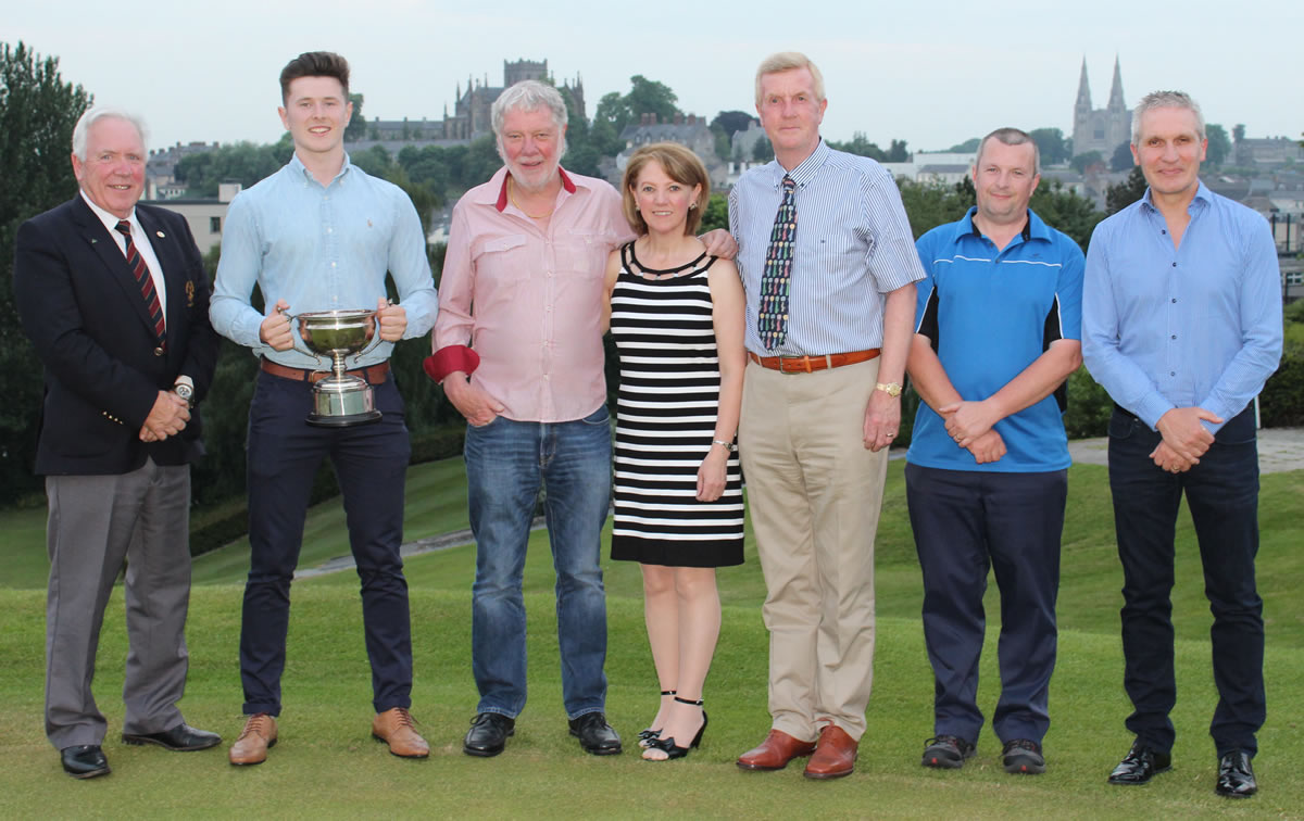Philip White and his younger sister Dolores Toigo, home on holiday from Canada, are pictured with County Armagh Golf Club Captain Martin Oliver and winners in the Henry and May White Memorial Trophy competition sponsored by Philip White Tyres Ltd. They are winner Joseph McElroy and runners up John Mawhinney, Gary Livingstone and John-George Willis.