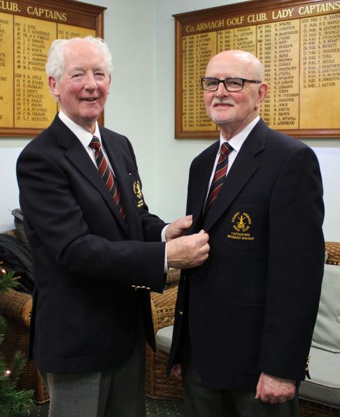 Walter Neville (right) the new President of County Armagh Golf Club is presented with his new President's blazer by outgoing President Dr Oliver Woods at the Presidential inauguration on New Year's Day.