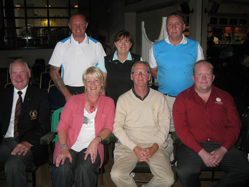 Winners of the Open Mixed Greensomes at County Armagh Golf Club, sponsored by Hillview Furniture, Ann and Hugh McEneaney (seated centre) are pictured with Club Captain Tom Calvert (front left) and Damien Smith, Proprietor Hillview Furniture. Runners up (back row from left): Jimmy Wilson, Ann and Richard Black.