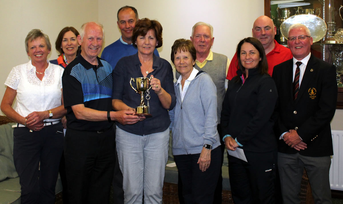 Mrs Kathleen Mallon presents the Iggy Mallon Memorial Trophy to inaugural winners Denis and Sheila Hughes. Included also is County Armagh Golf Club Captain Richard Stewart (right) along with runner up prize winners in the Mixed Greensomes competition.