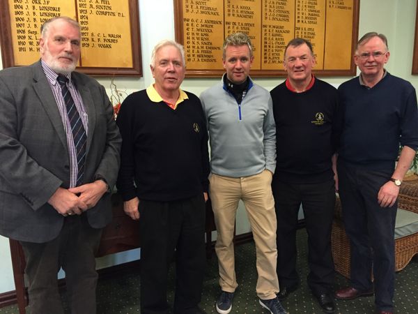 Country Music star Mike Denvir (centre) is pictured with Kieran McAnallen from Armagh City Hotel, County Armagh Golf Club Vice Captain Marty Oliver, Club Hon. Secretary Paddy Burns and and club member Colm Quinn.