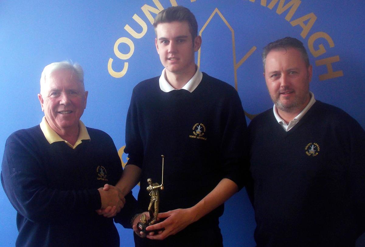 Senior Juvenile Stableford winner Adam Cromwell is congratulated by County Armagh Golf Club Captain Martin Oliver. Looking on is Juvenile Convenor Neil Cromwell.