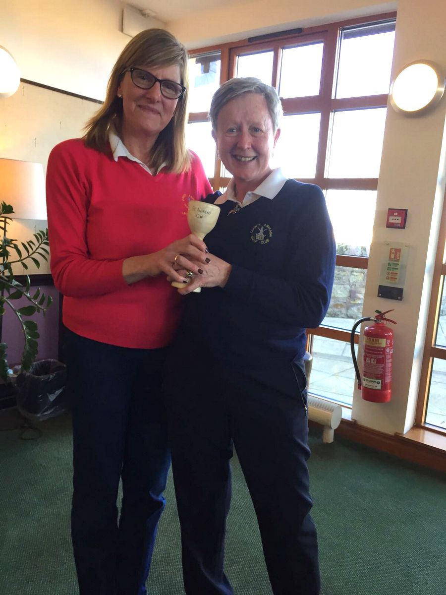 The golf began in earnest on the Monday in outstanding weather. The scores over the magnificent Eden course, reflected the benign conditions. A full list of prize winners is set out below but the winner of the St. Andrew's Cup, turned by June Humphries and skilfully inscribed by Nicola Spence, was Sylvia Ashe with an outstanding 40 points.