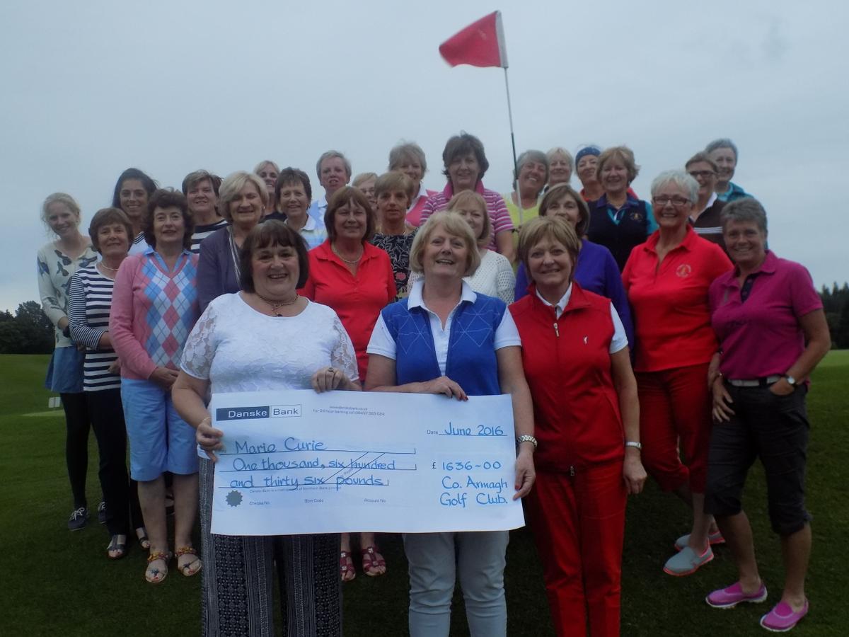The Lady Captain Mrs Una Cullinane presents a cheque to the value of £1636 for Marie Curie Cancer Care. The money raised was in lieu of gifts on her recent Lady Captain’s Day.